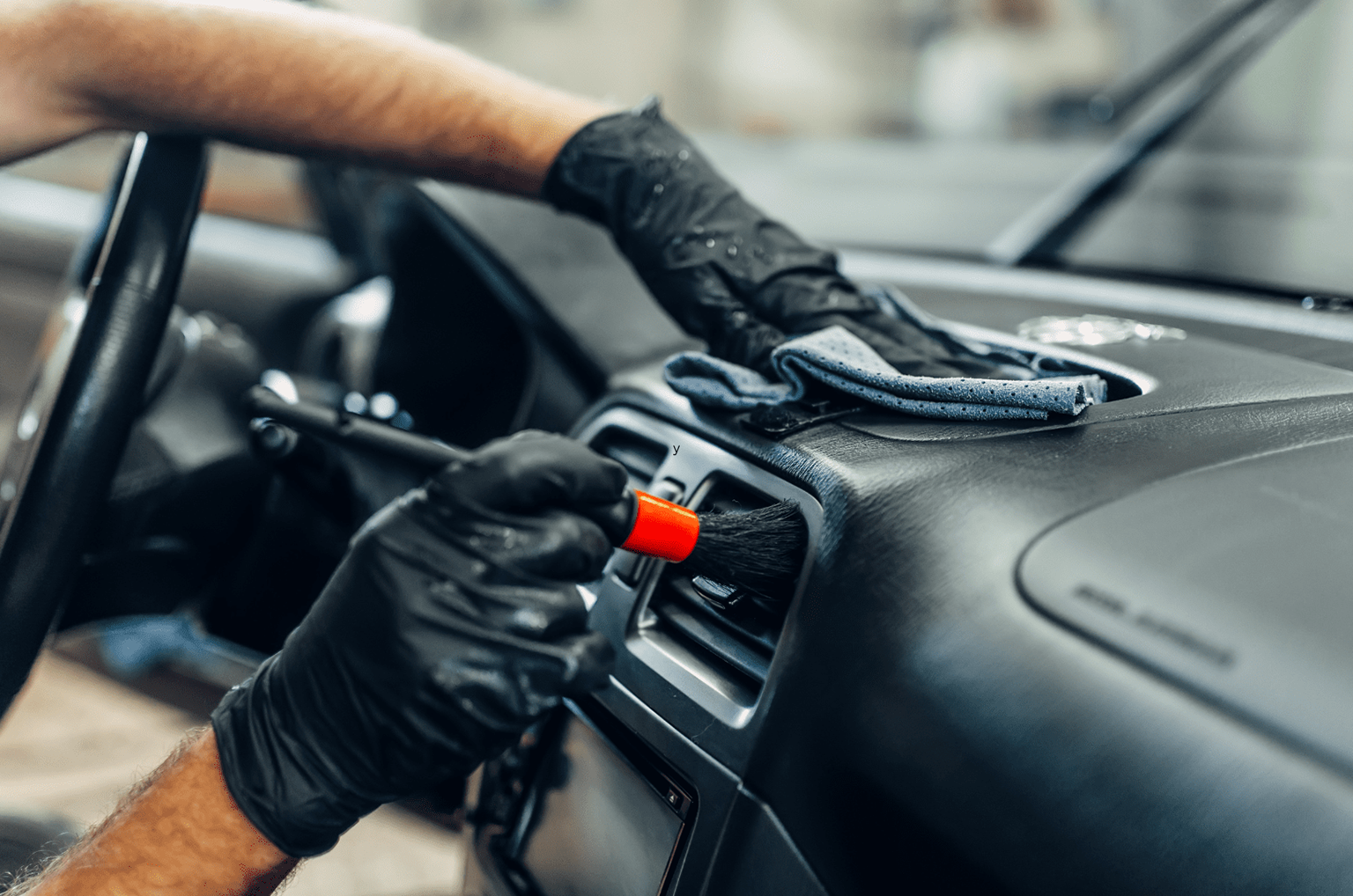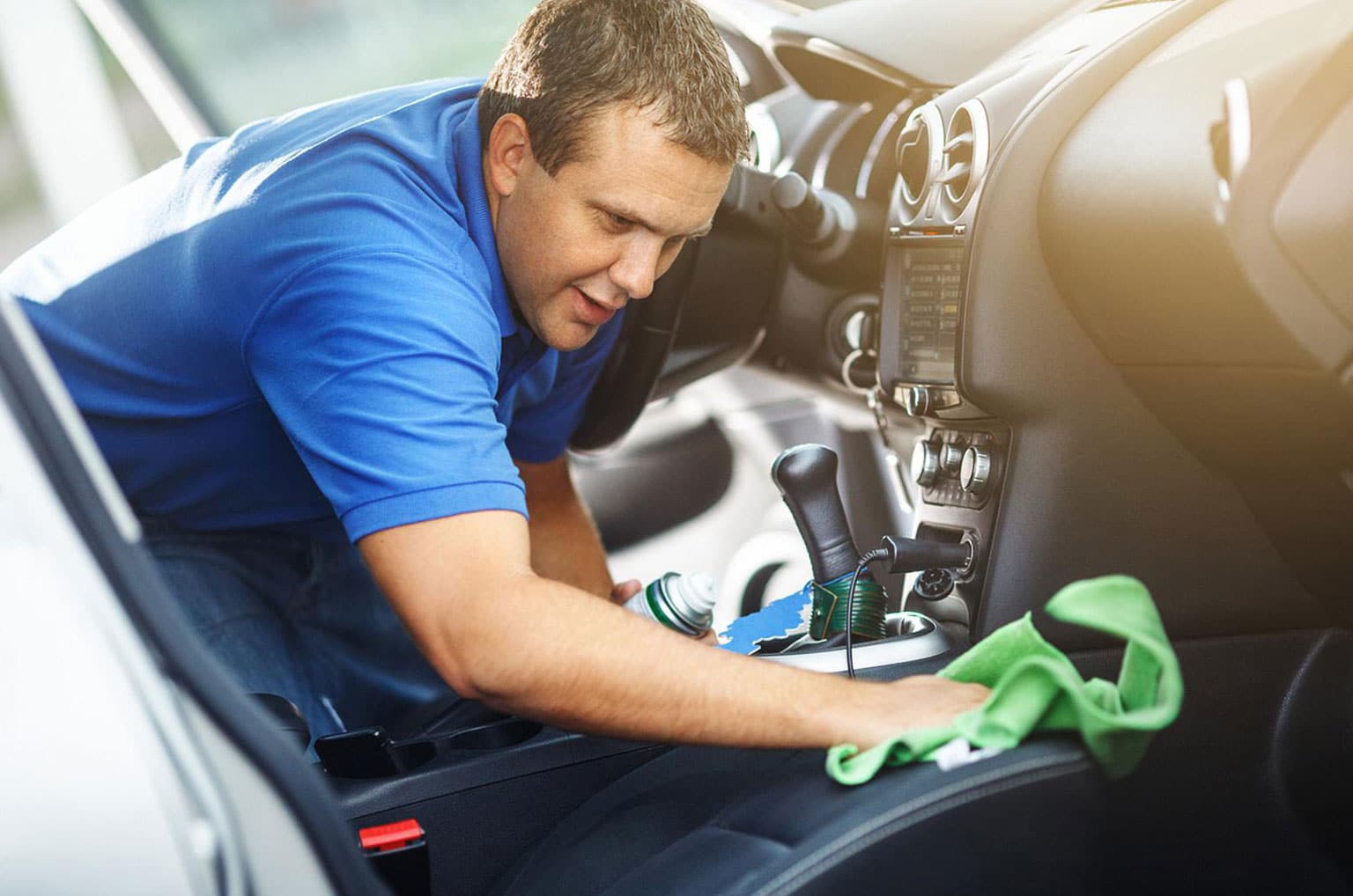 Clean and e grease all interior plastics, vinyl, leather and upholstery panels. (NO SEATS) seats light wipe down only. Clean and de grease all cup holders, vents, buttons, cracks and crevices. Apply water base dressing for ultimate uv protection and non-greasy shine.